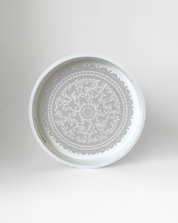 Charola de servicio redonda con detalles grabados sobre madera a mano, pintados en color gris sobre base blanca.
