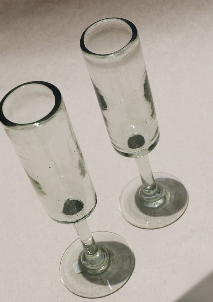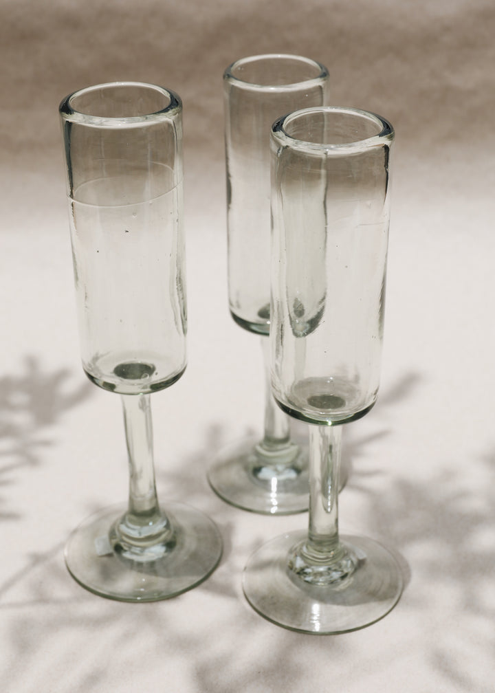 Copa de vidrio soplado para champagne, con diseño rústico.