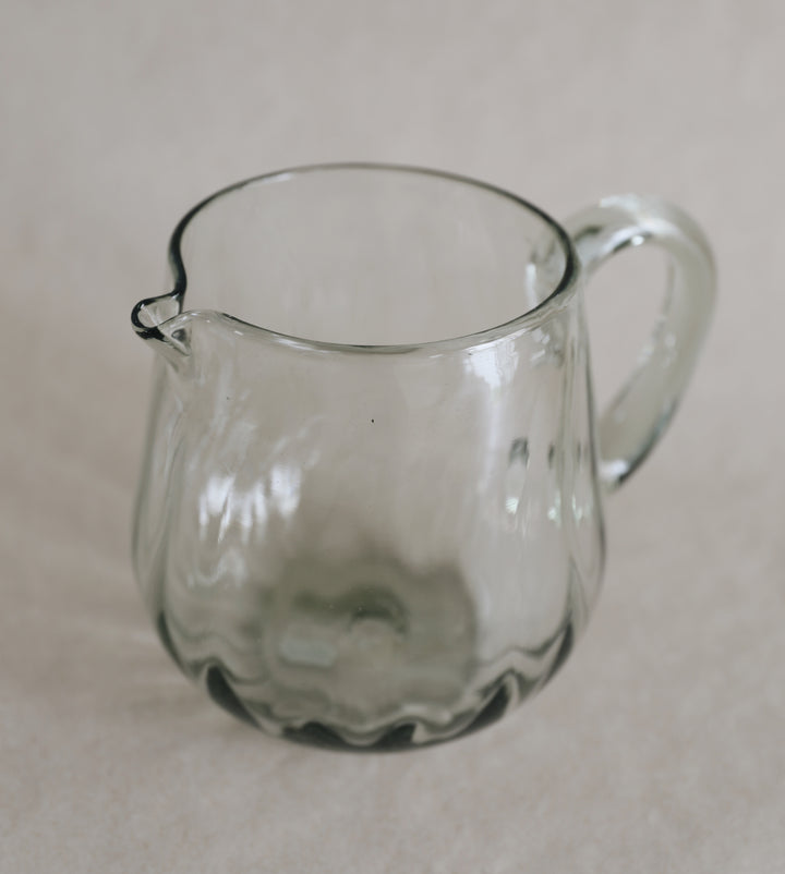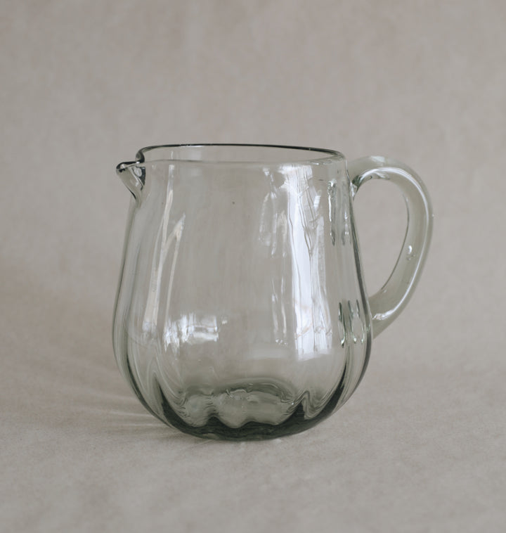 Jarra de vidrio soplado transparente de forma acalanada con asa.