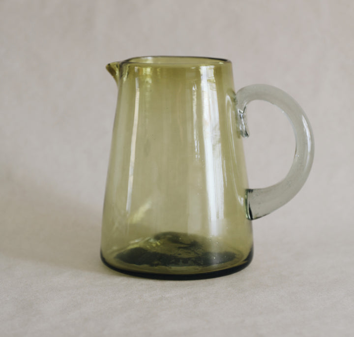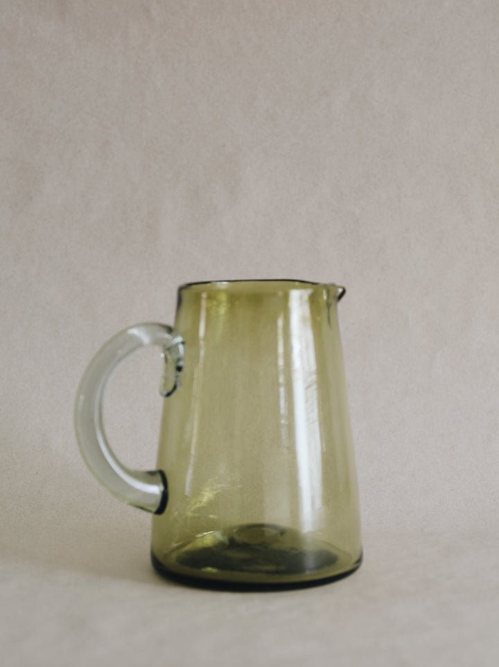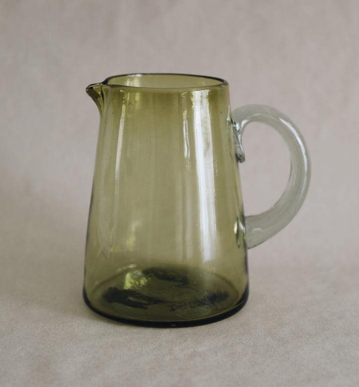 Jarra de vidrio soplado, en diseño óptico, color olivo con asa transparente.