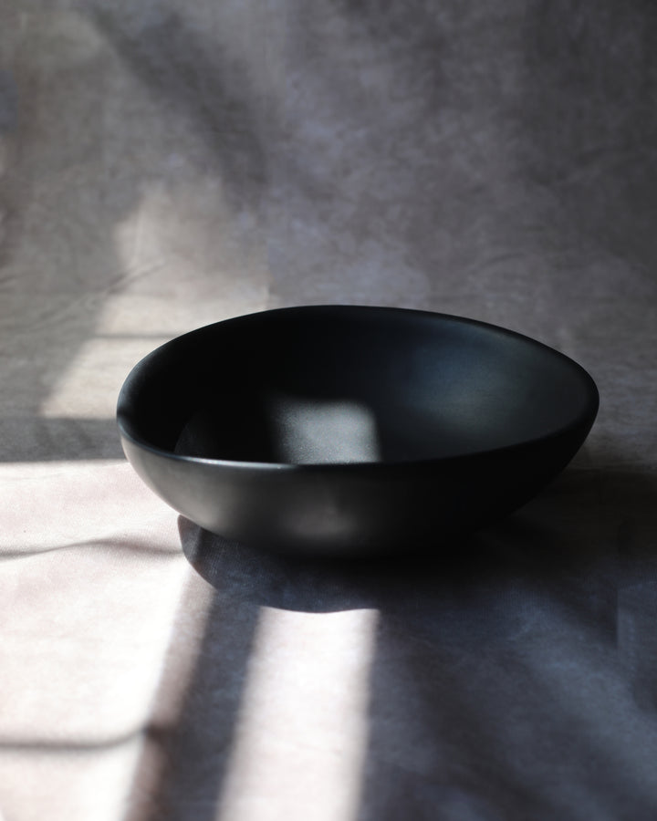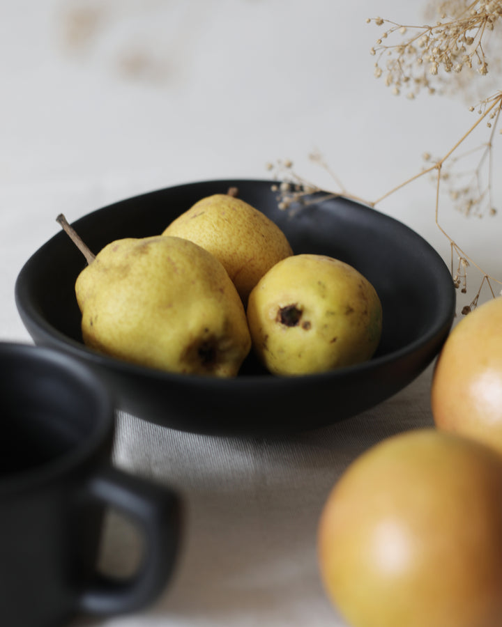 Vajilla de cerámica color negro simple, para 4 pax. Pintada a mano.