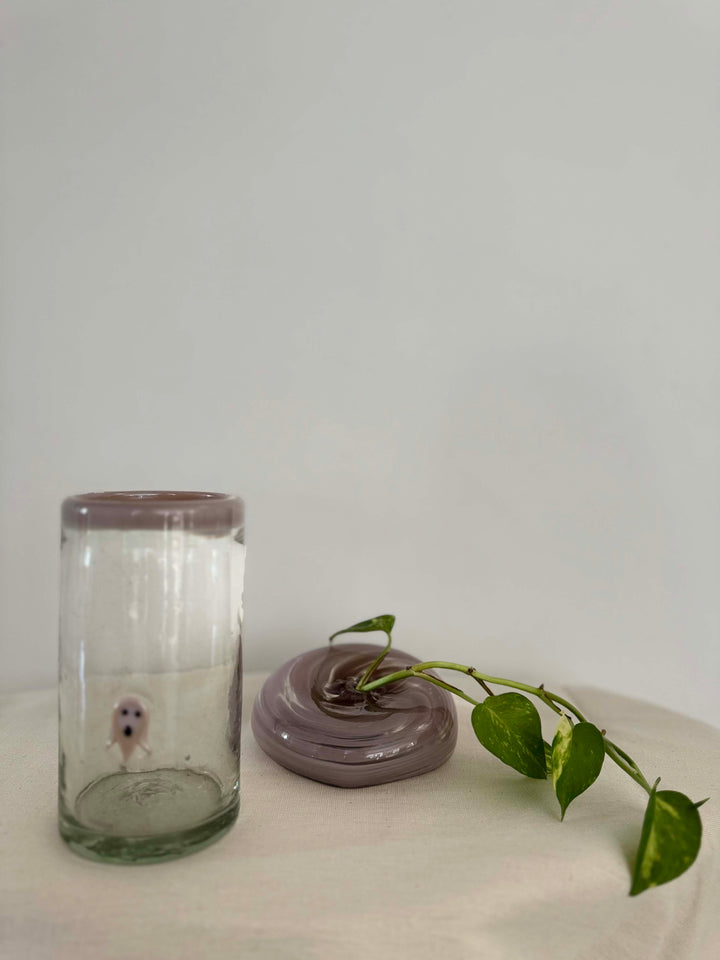 Vaso tipo High Ball con detalle de fantasma en color lila, y detalle de filo en lila.