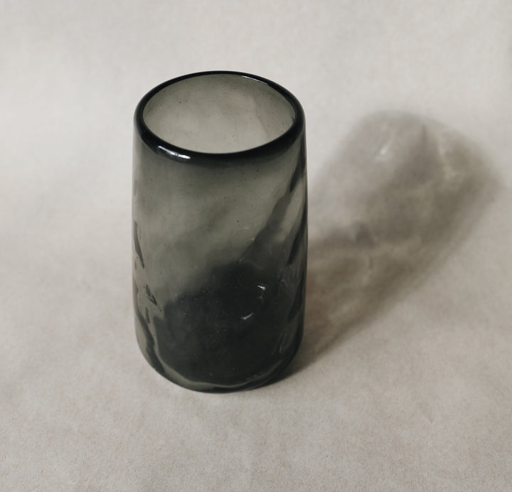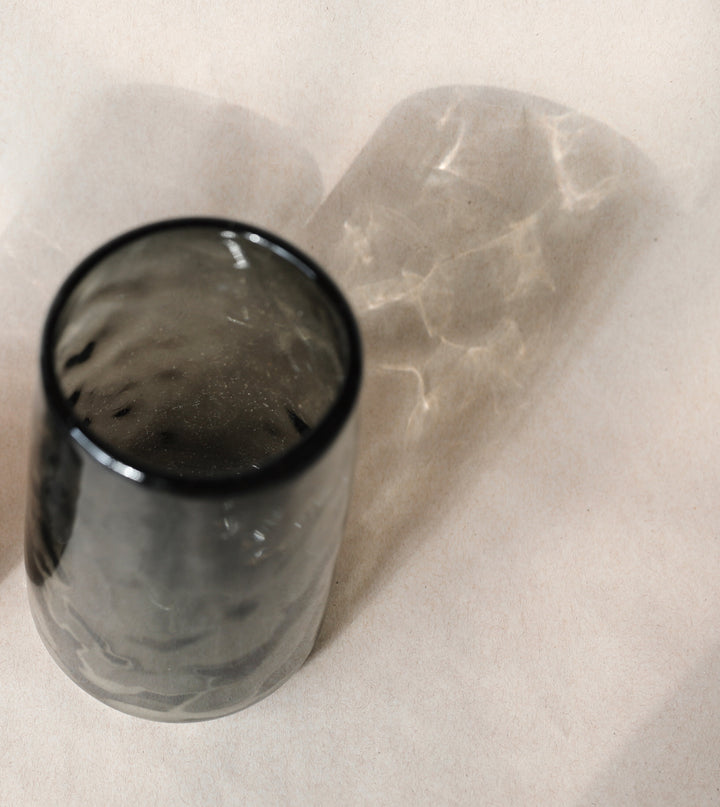 Vasos de vidrio soplado texturízado, estilo HighBall en forma cilíndrica, color humo.