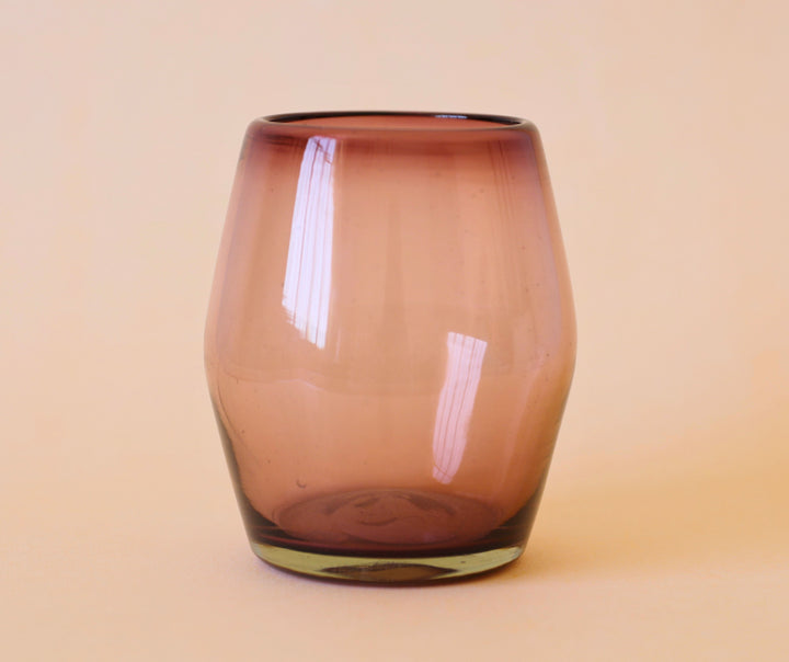 Vaso de vidrios soplado estilo Old Fashion, en forma de barril, color amatista. Dale ese toque original con nuestras piezas únicas.