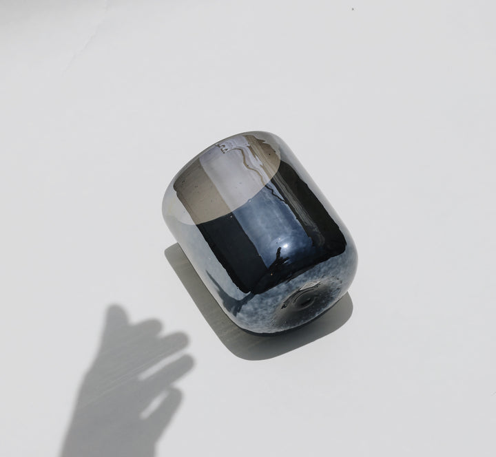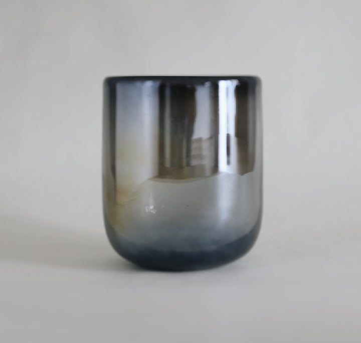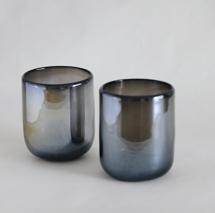 Vaso de vidrio soplado estilo Old Fashion color humo, terminado lustre, en forma boleada.